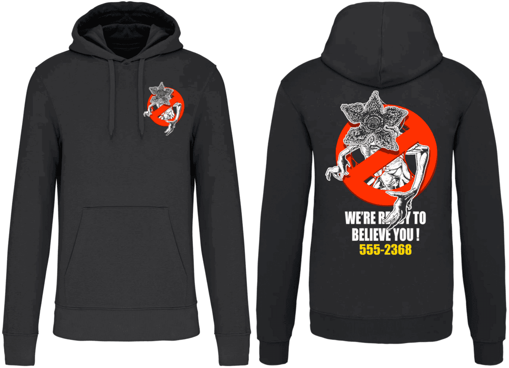 Un mélange parfait entre Stranger Things et Ghostbusters, imprimé en petit devant et en grand derrière pour un style qui explose tout sur son passage.